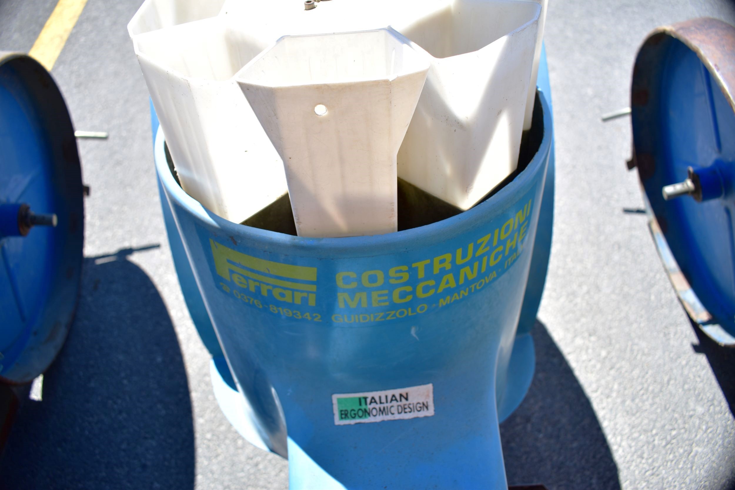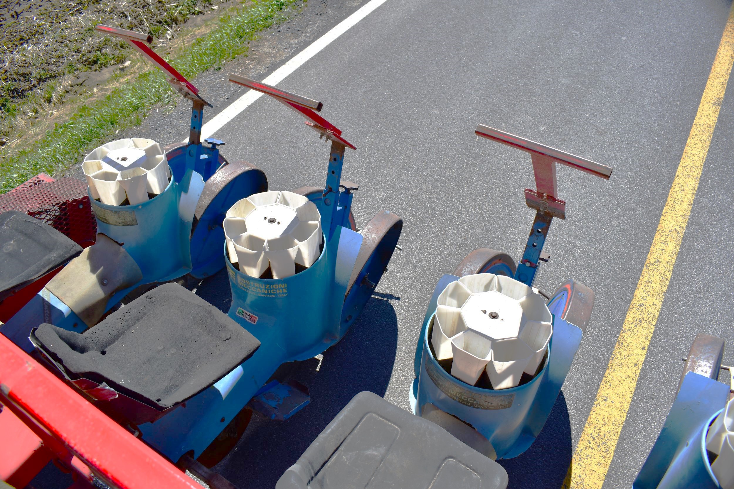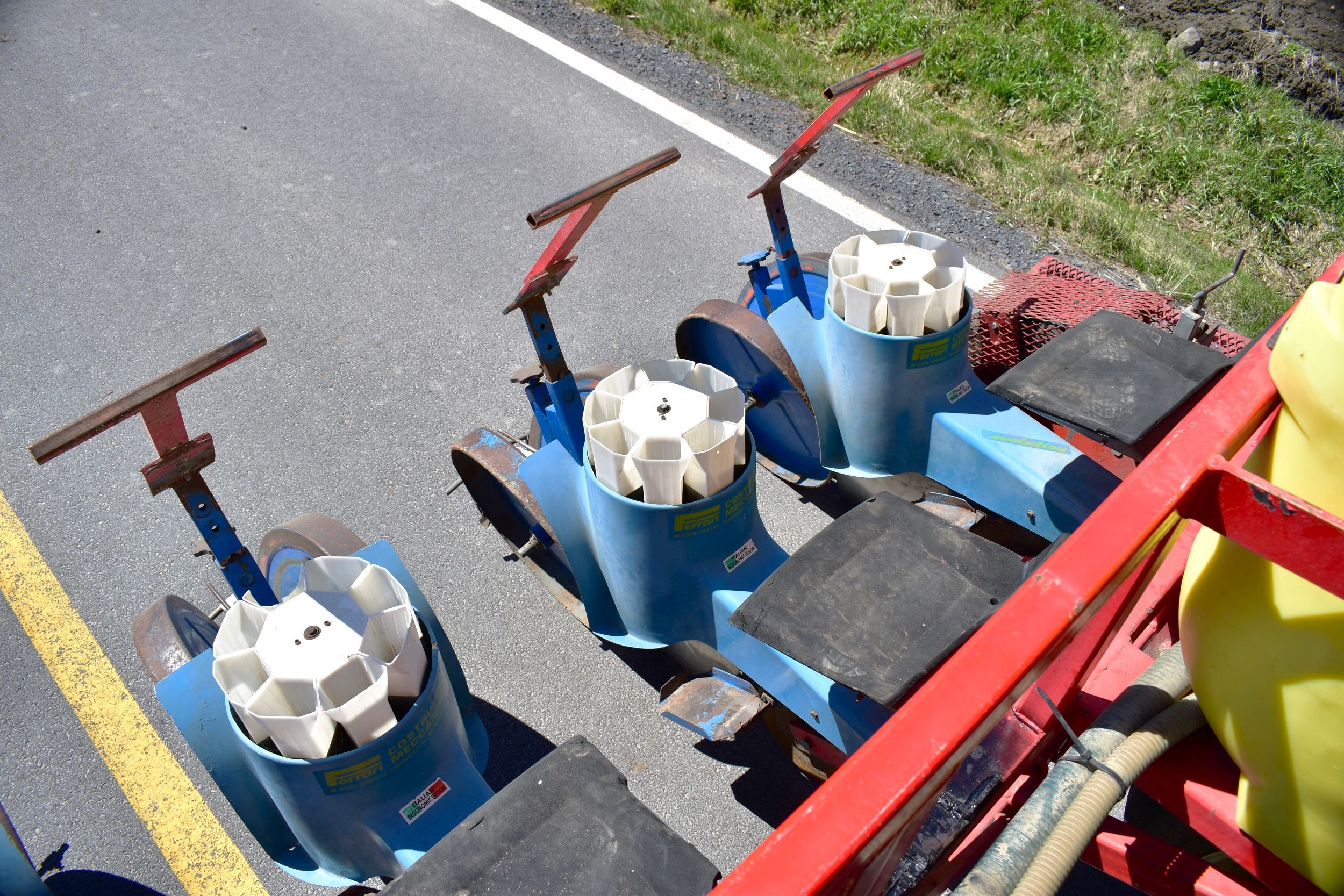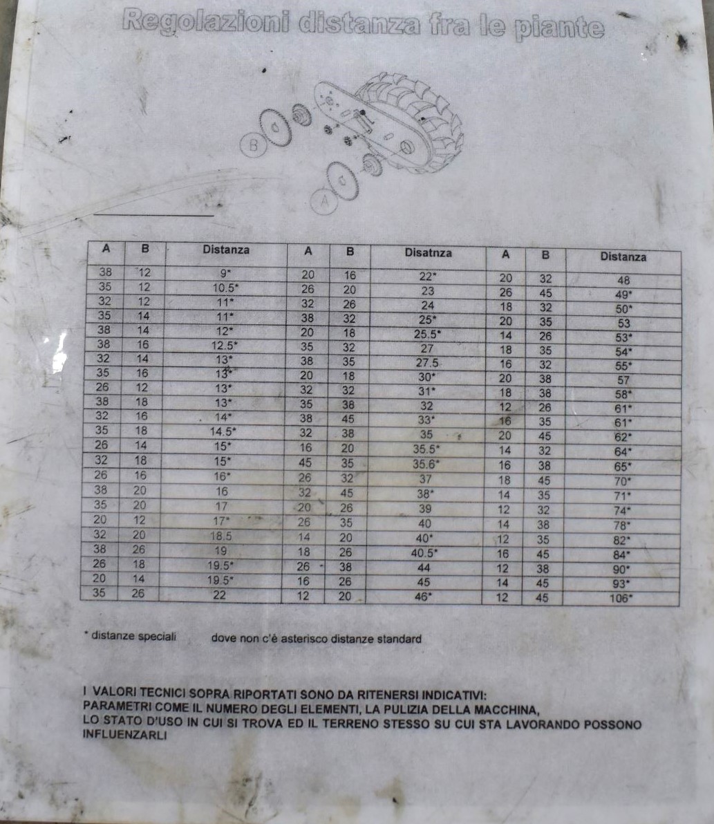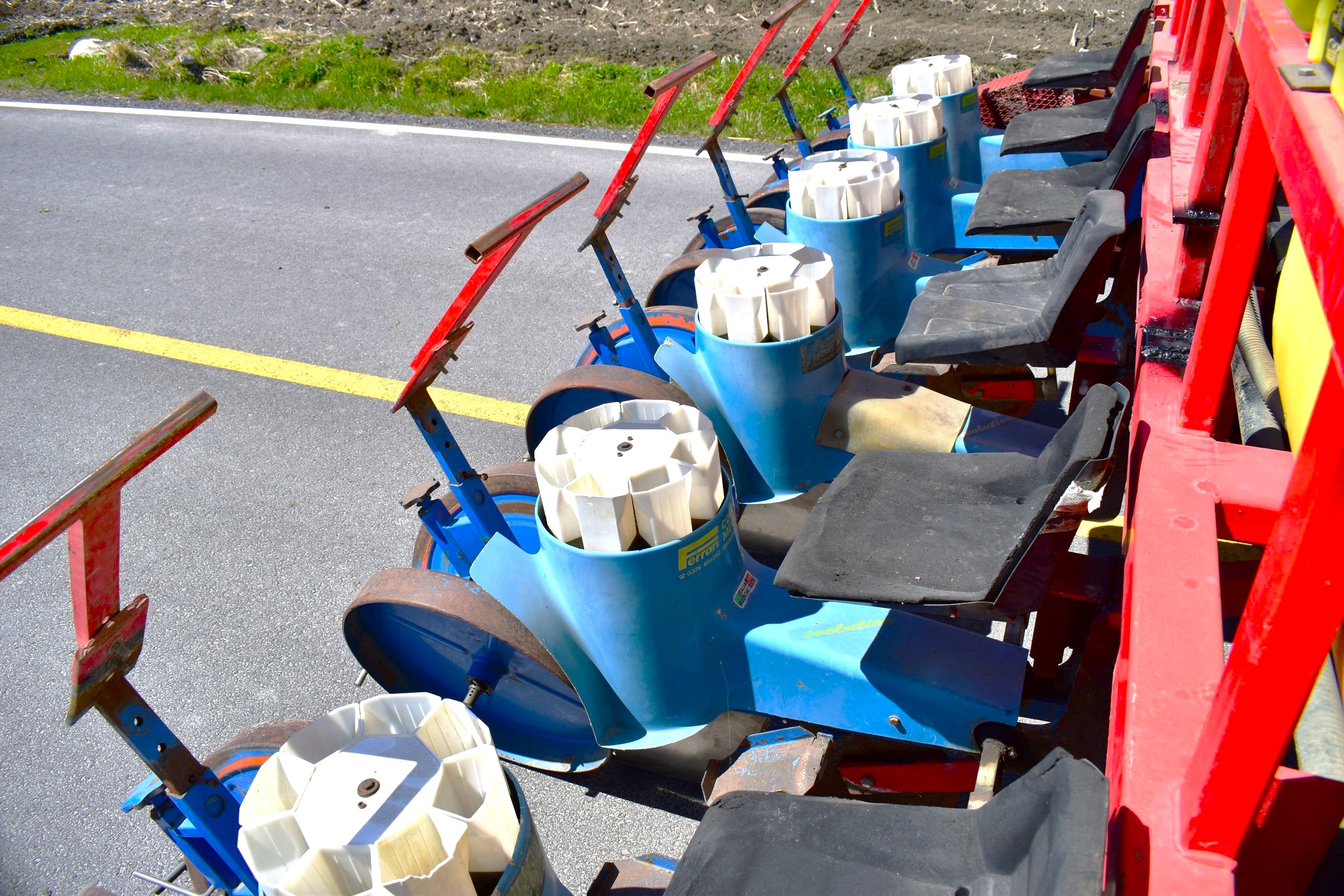 Ferrari transplanter, model FX 6 rows at 30 inches…8 bucket carousel with 2” 3/4 passage (cauliflower, brocolli, etc)…Two drives, two transmissions for spacing adjustment…Spacing between plant from 5,5 to 30 inches (see chart)…Front discs for residues…Stainless steel socs…Press drill wheels for depth can be adjusted quickly by crank…Adjustment right-to-left (see photo) allows you to tighten the pressure on the transplant for a perfect planting result…Water tanks are offset forward for weight distribution…4 wheels 11L-15 SL for stability…Many gears (see photo) for spacing adjustment are included…We clear customs and ship quickly everywhere in USA and Canada, just contact us!