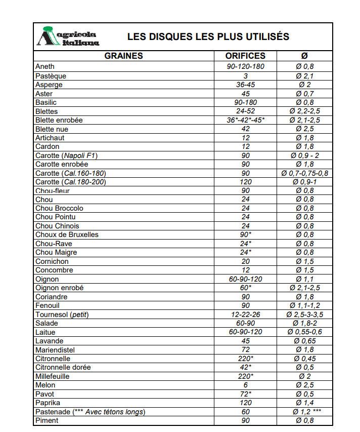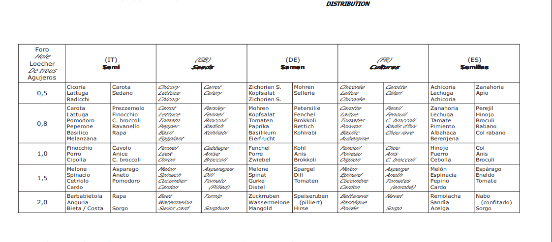 -Gaspardo Orietta…De 0.5mm à 2.00mm…carottes/oignons ligne simple et double…navets ligne simle…betteraves ligne simple.